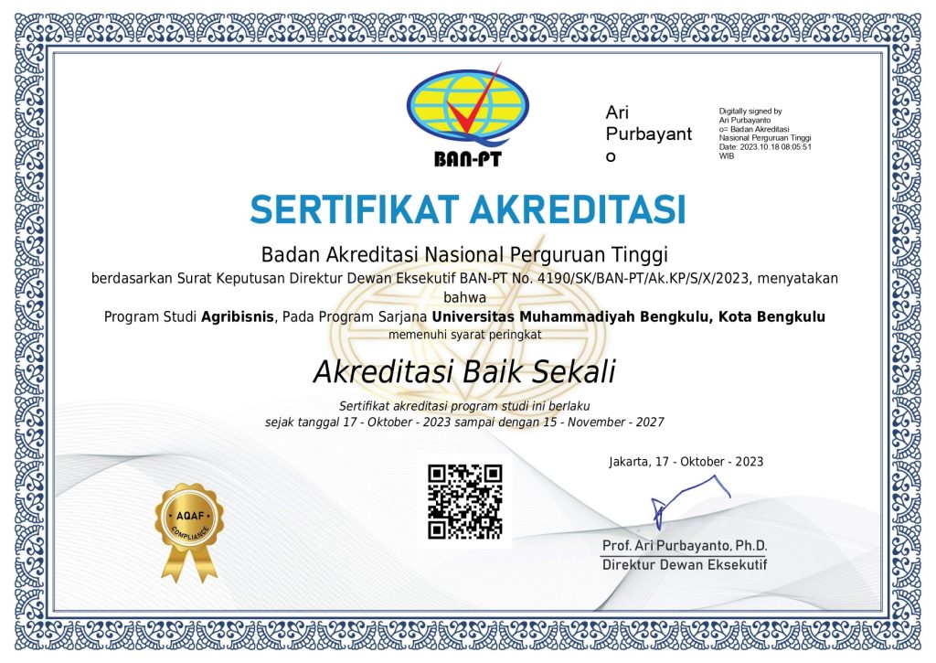 Program Studi Agribisnis dengan akreditasi BAIK SEKALI sejak tanggal 17 Oktober 2023 sampai dengan 15 November 2027 berdasarkan Surat Keputusan Direktur Dewan Eksekutif BAN-PT No. 4190/SK/BAN-PT/Ak.KP/S/X/2023.
